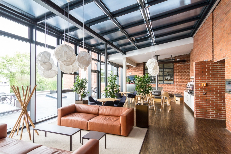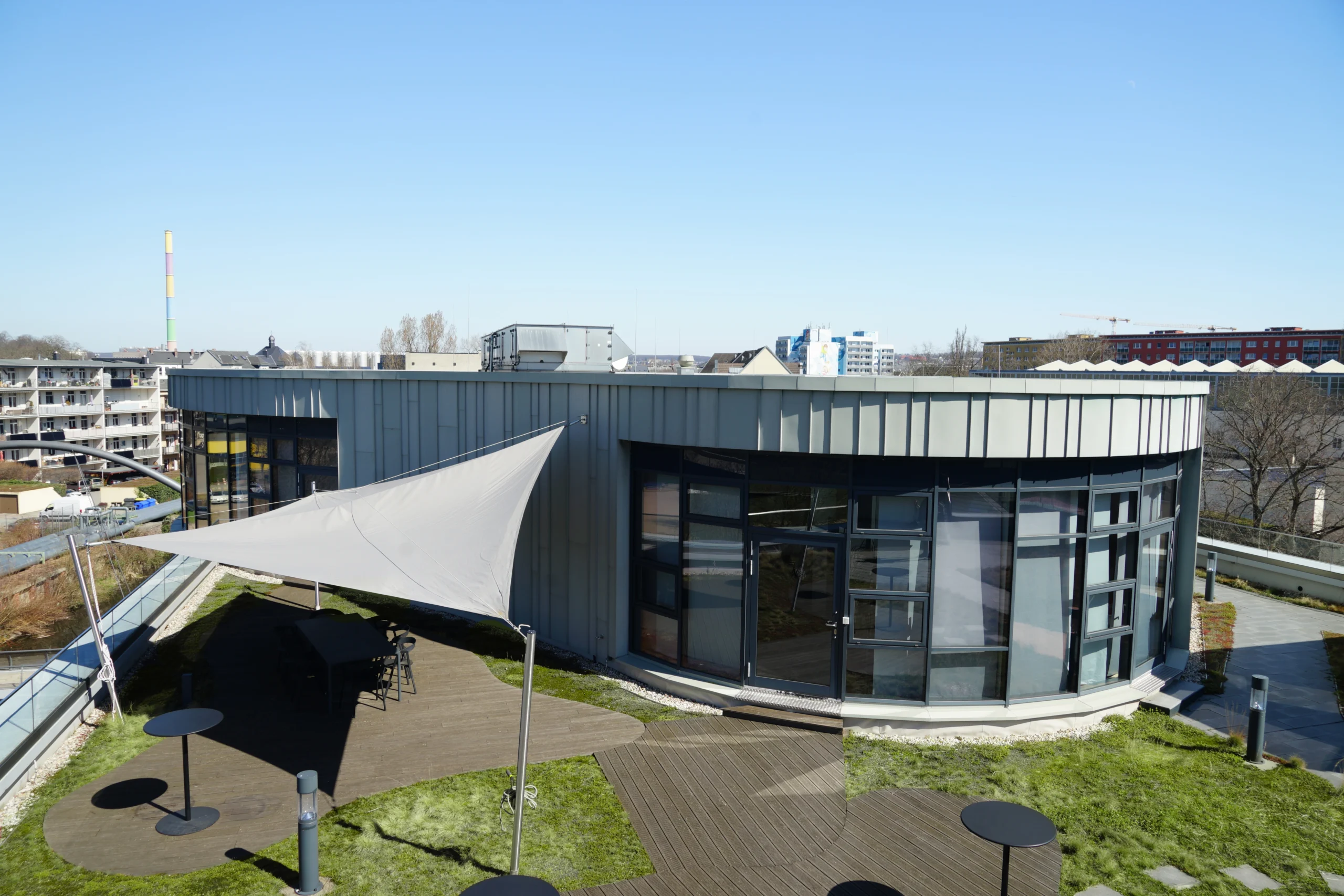 Ein Highlight ist der lichtdurchflutete Wintergarten mit direktem Zugang zur Terrasse. Hochwertig ausgestattete Meetingräume führen auf eine exklusive Rooftop-Terrasse mit Blick über die Stadt – perfekt für Besprechungen in entspannter Atmosphäre oder erholsame Pausen.